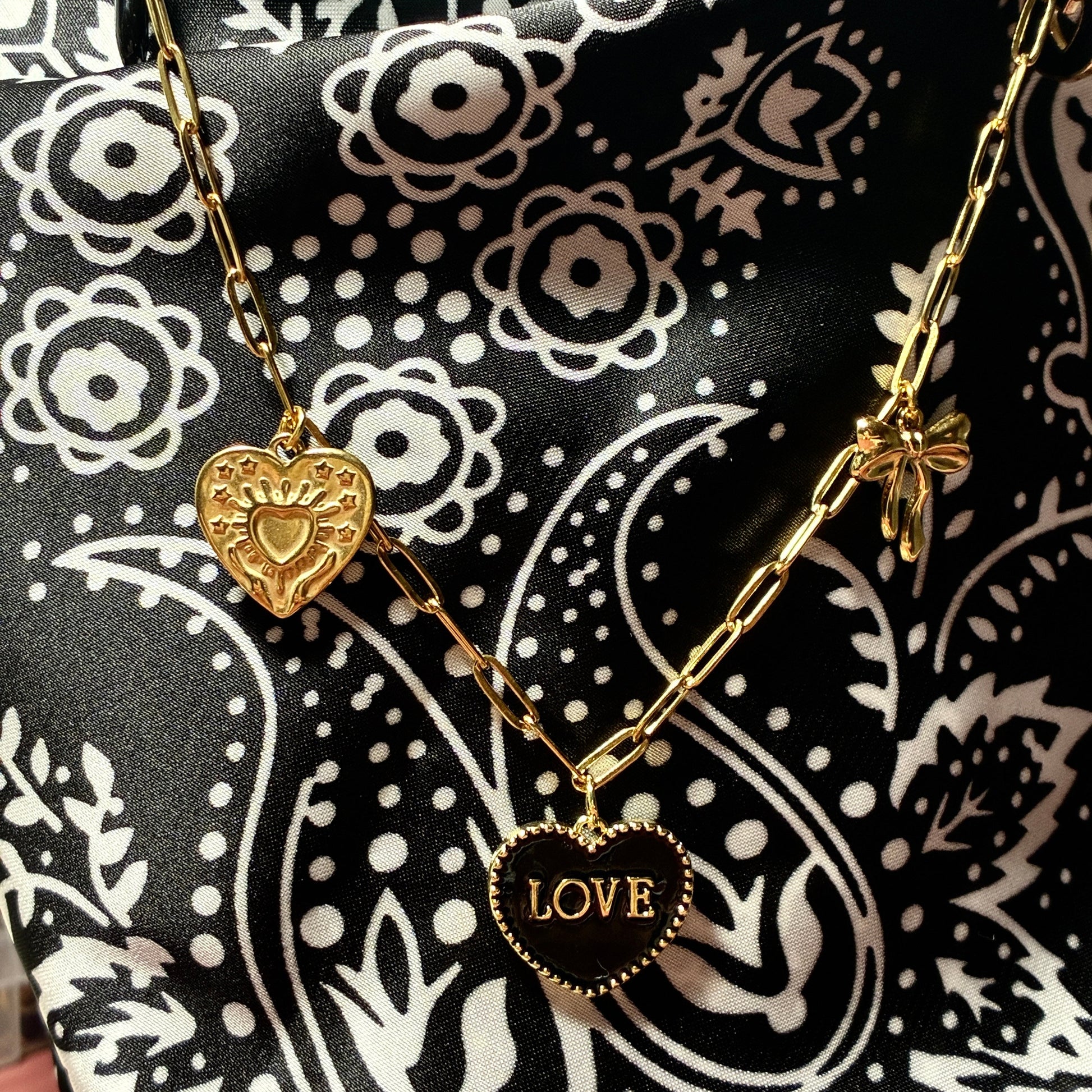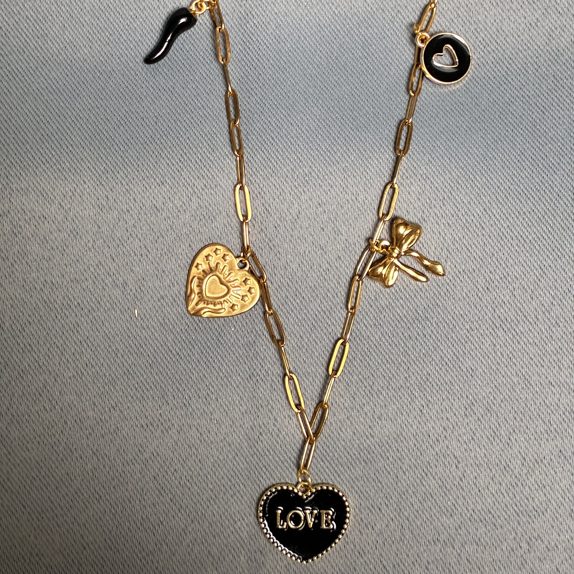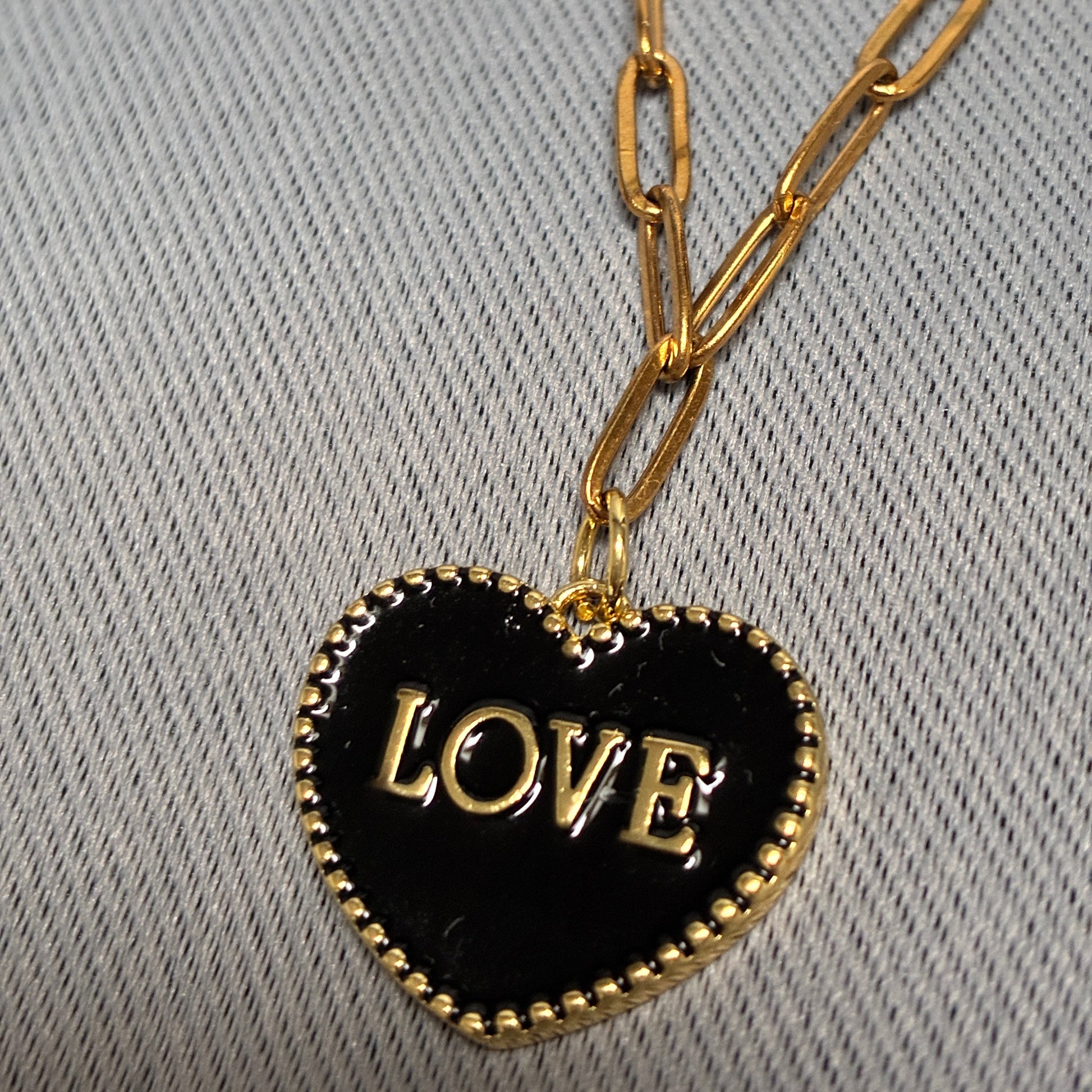 Un collier qui affirme ses sentiments autant que ton style. Ses breloques noires et or matchent parfaitement avec un look casual ou plus élégant.